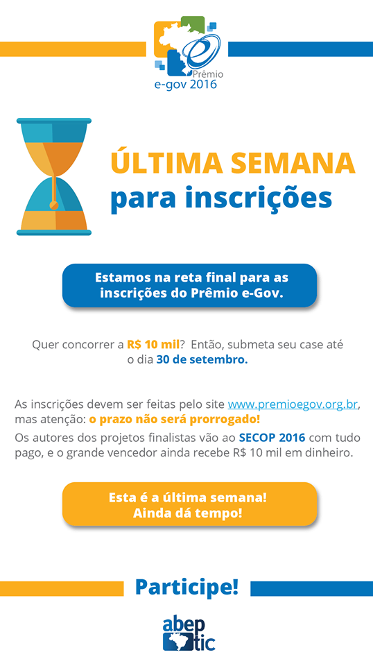 Estamos na reta final para as inscrições do Prêmio e-Gov. Esta é a última semana, corra para inscrever seu case!
